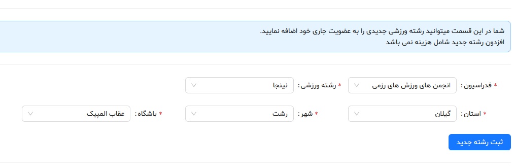 کزینه ثبت رشته جدید را بزنید.. به صورت اینترنتی هم اکنون می توانید کارت بیمه ورزشی خود را ثبت و پرداخت کنید.